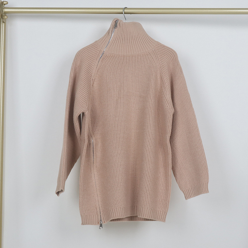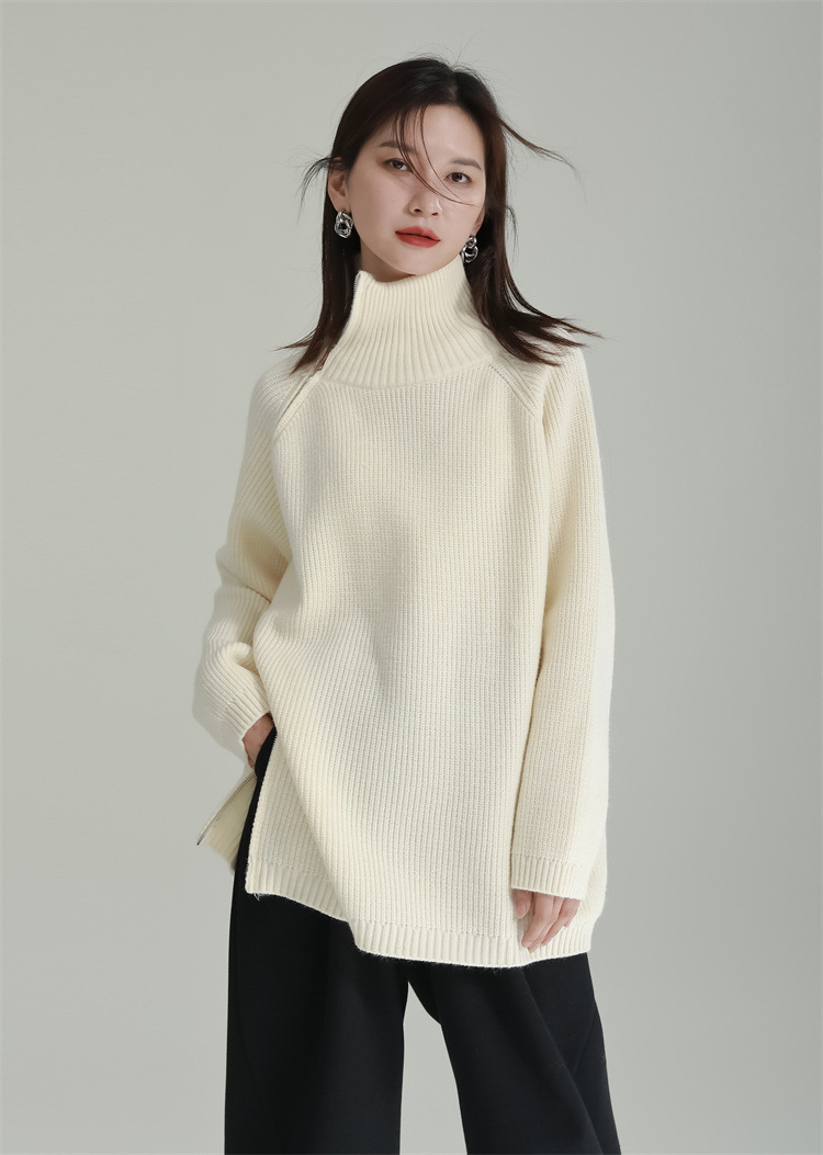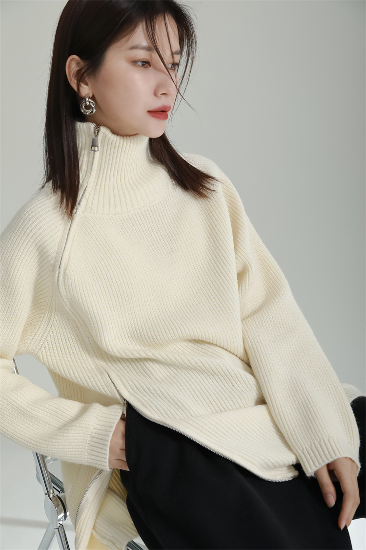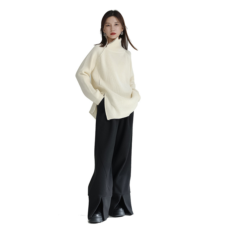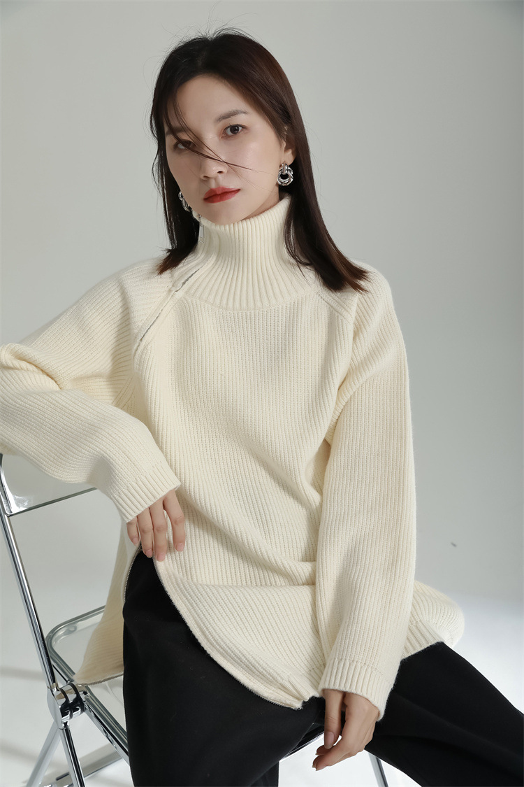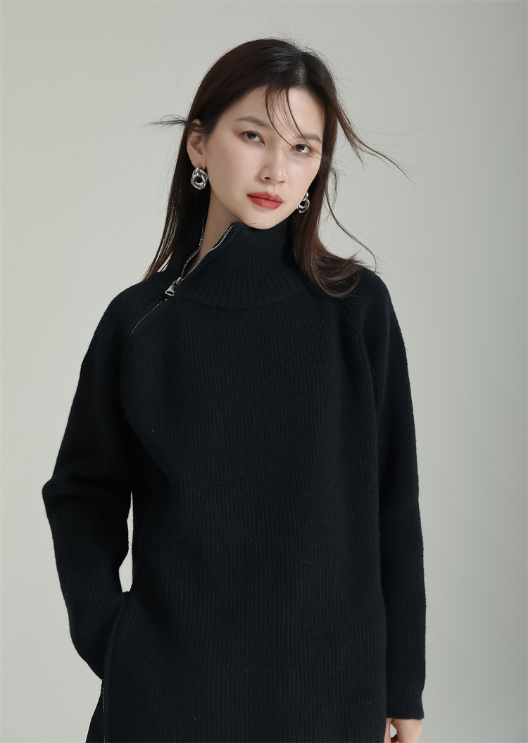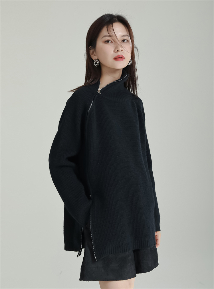 タートルネック風の高めの襟元と不規則なカッティングが特徴的で、他にはない独特なシルエットを演出します。