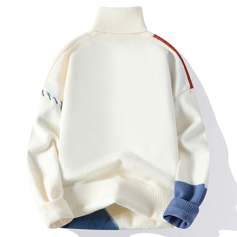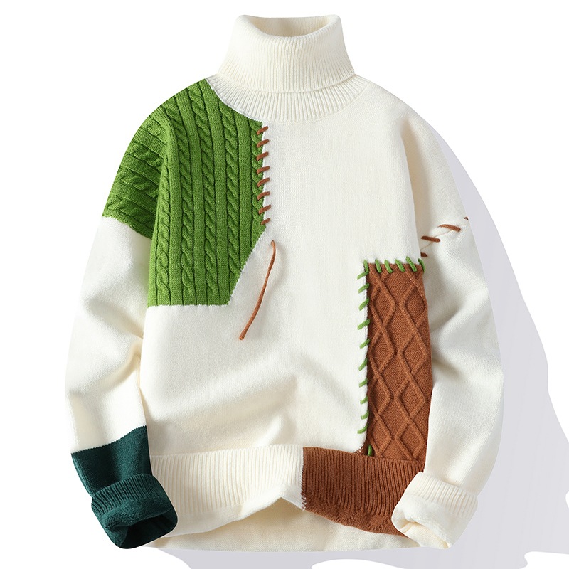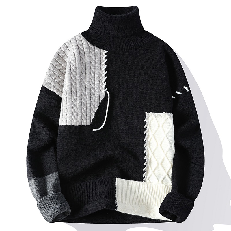 異なる編み柄を大胆に組み合わせた個性的なデザインが魅力のタートルネックセーターです。