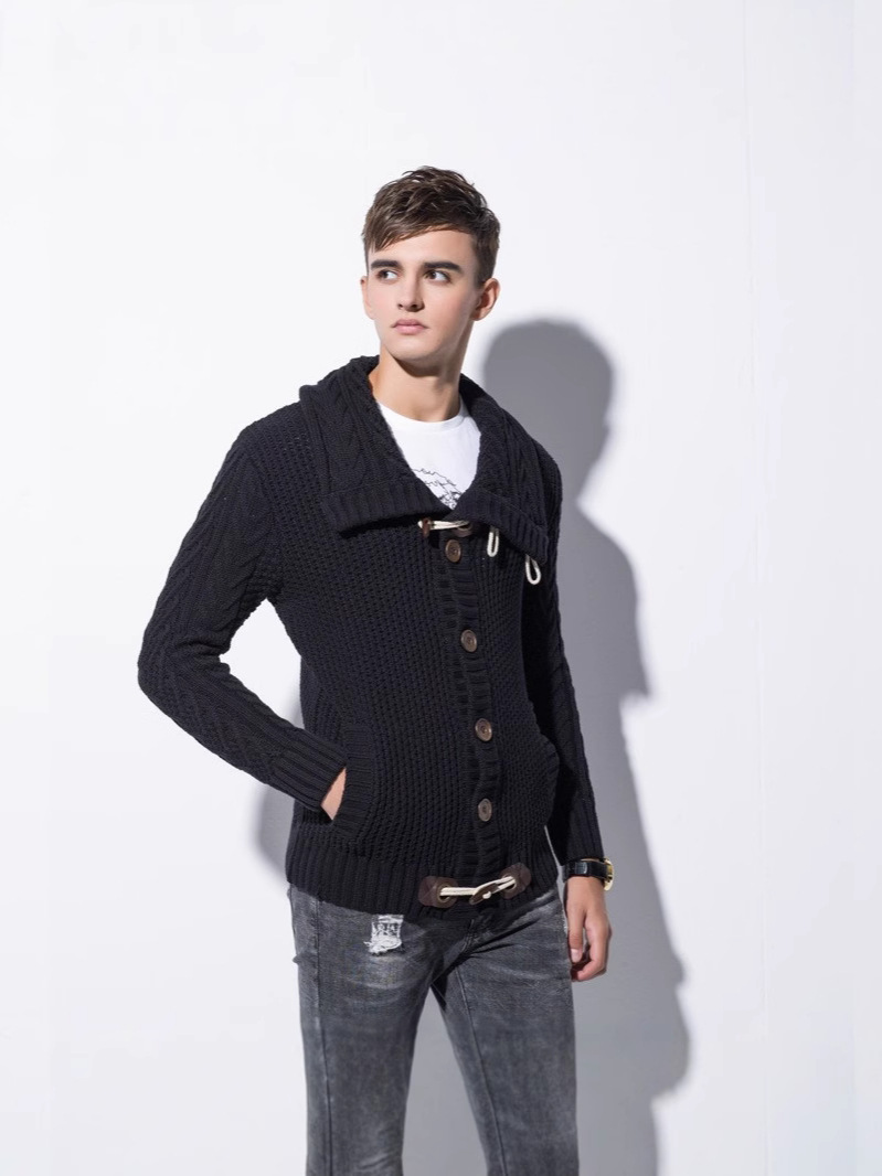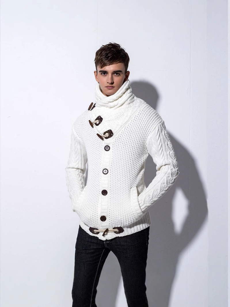 ボリューム感のあるタートルネックと個性的なトグルボタンが特徴的なカーディガンです。